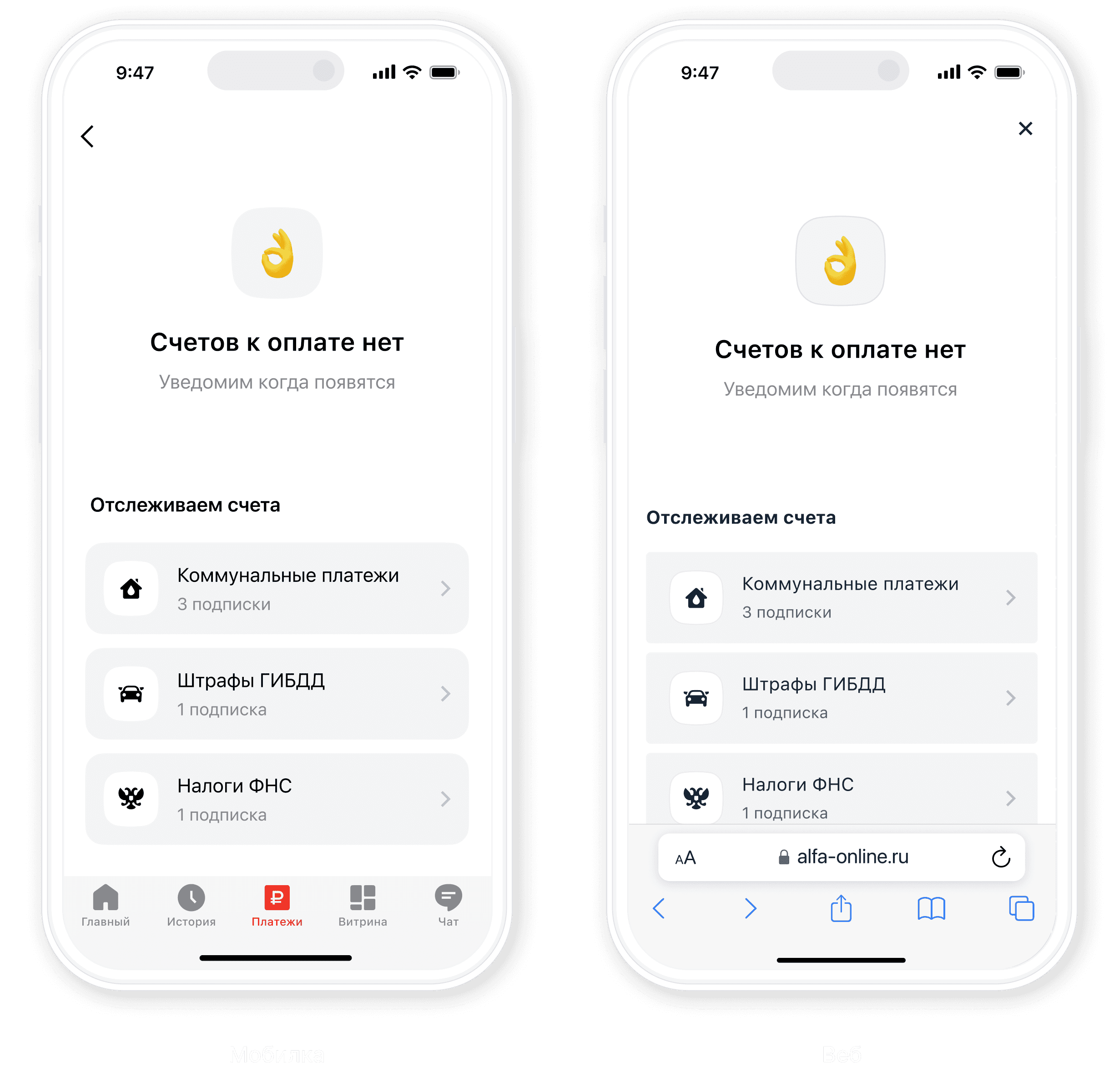 I made the “No bills” state explicit and unambiguous. It is clearly distinct from the state with active bills and can be understood instantly, without requiring users to interpret the interface.