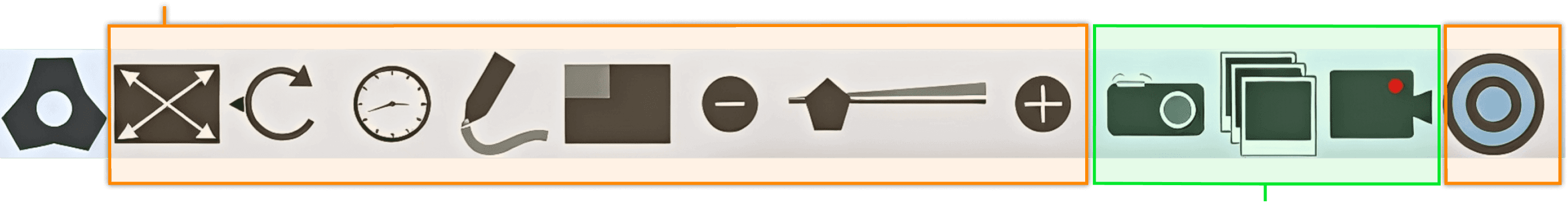 Access to different tool groups is handled through toggles, saving space and clarifying the purpose of the selected group.