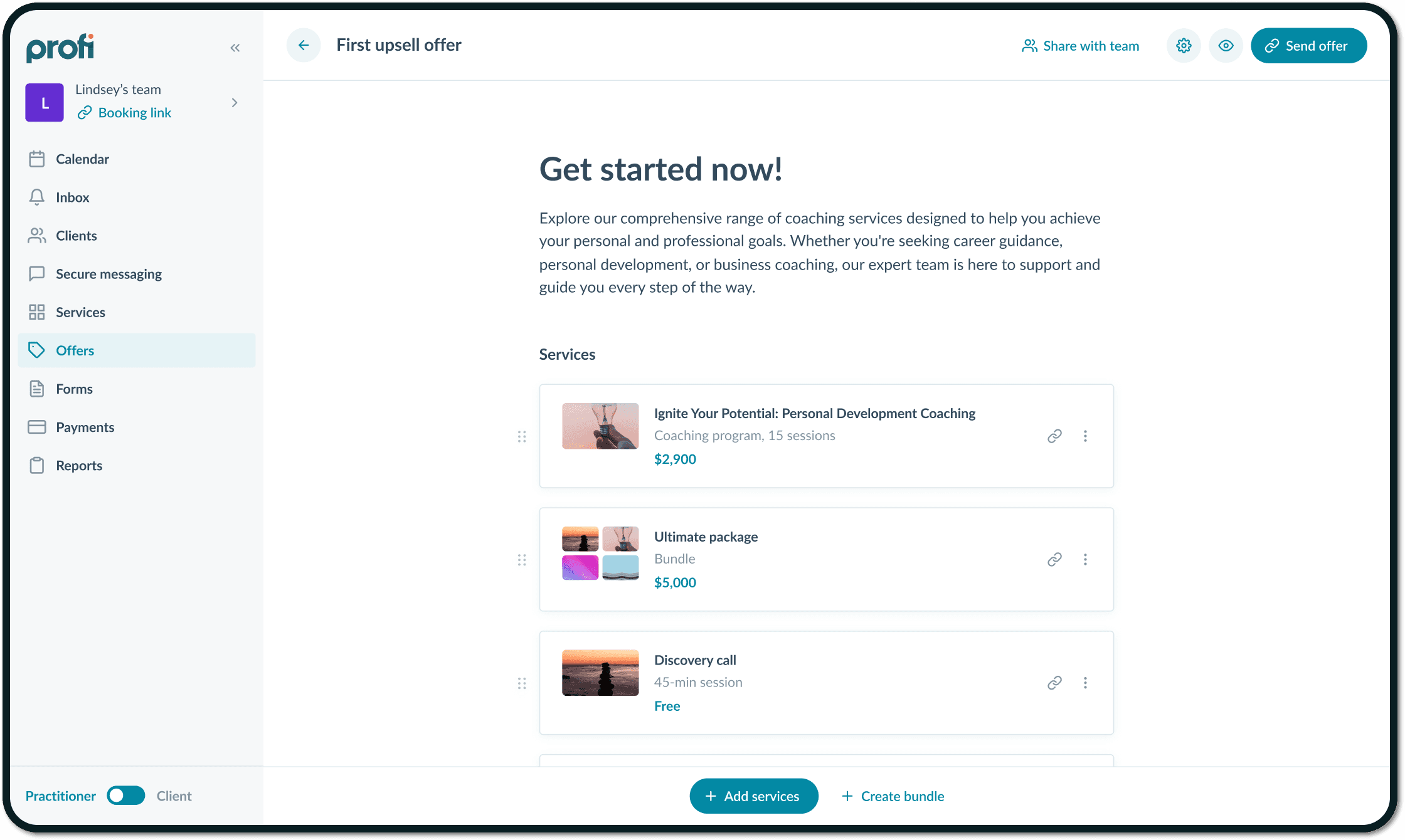 Пользователь может добавить в оффер сервисы, настроить модель оплаты и стоимость, а потом отправить оффер клиенту.