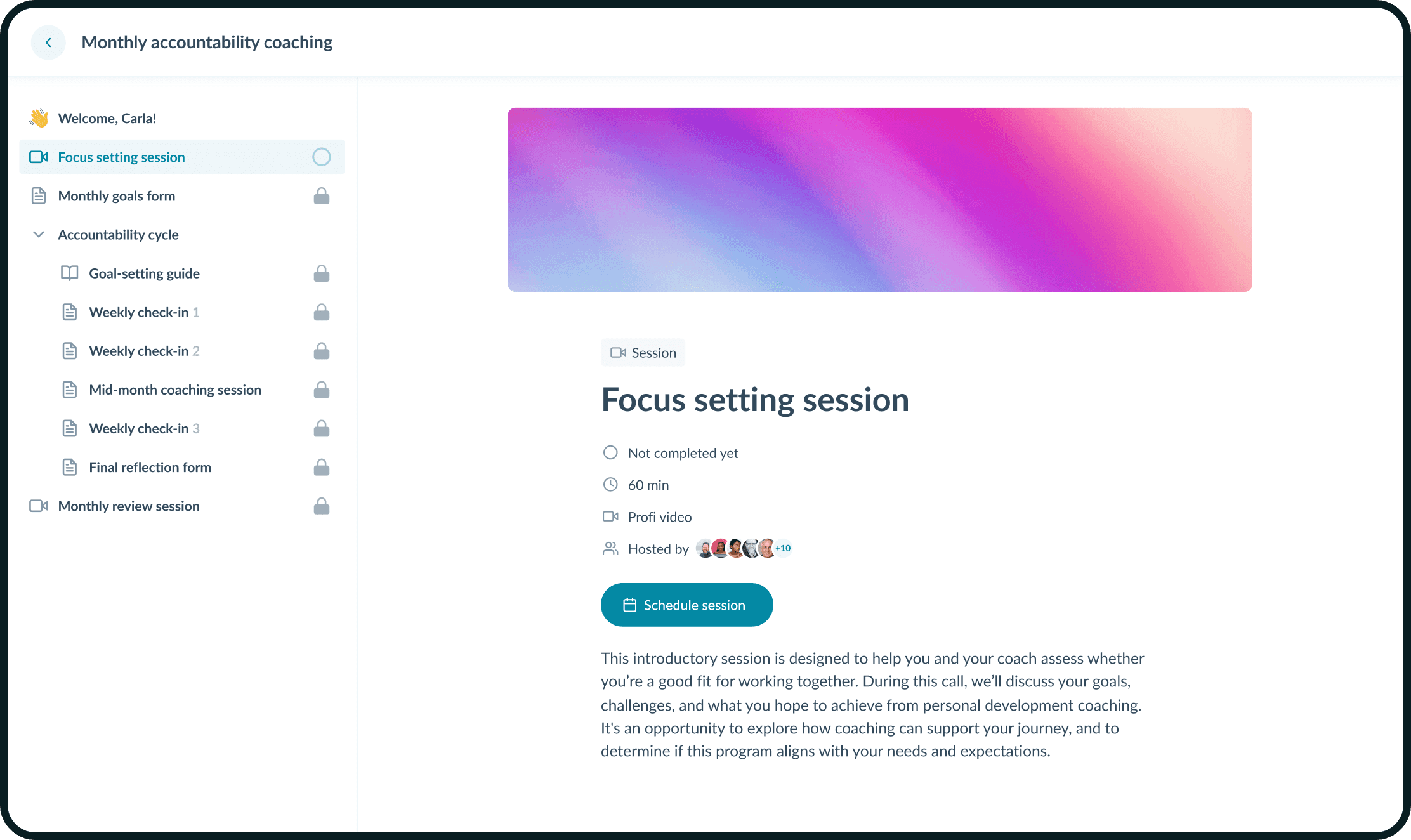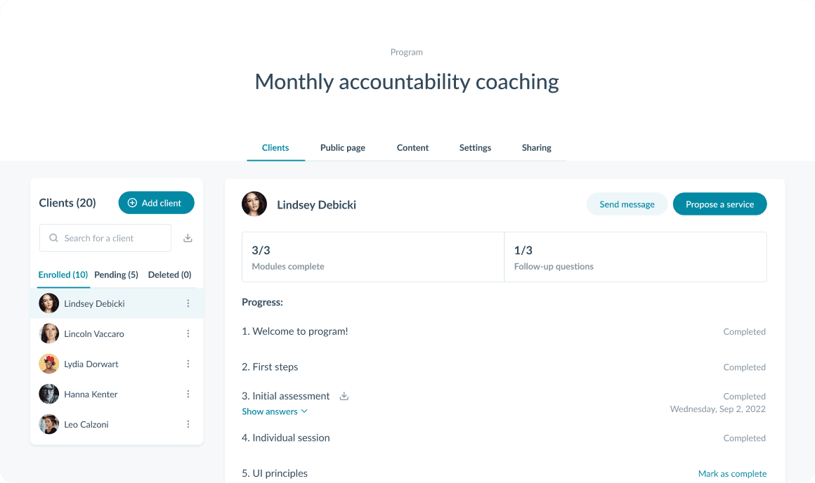 Работа коучей строится вокруг клиентского пути, который проходит через серию сессий, форм и учебных материалов.