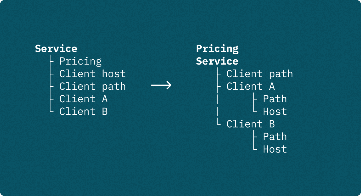 Я объединил разные инструменты в один, отделил стоимость от услуги, а клиентский путь и хоста вынес на уровень клиента, чтобы сервис больше не определял, как и с кем работают все клиенты сразу.
