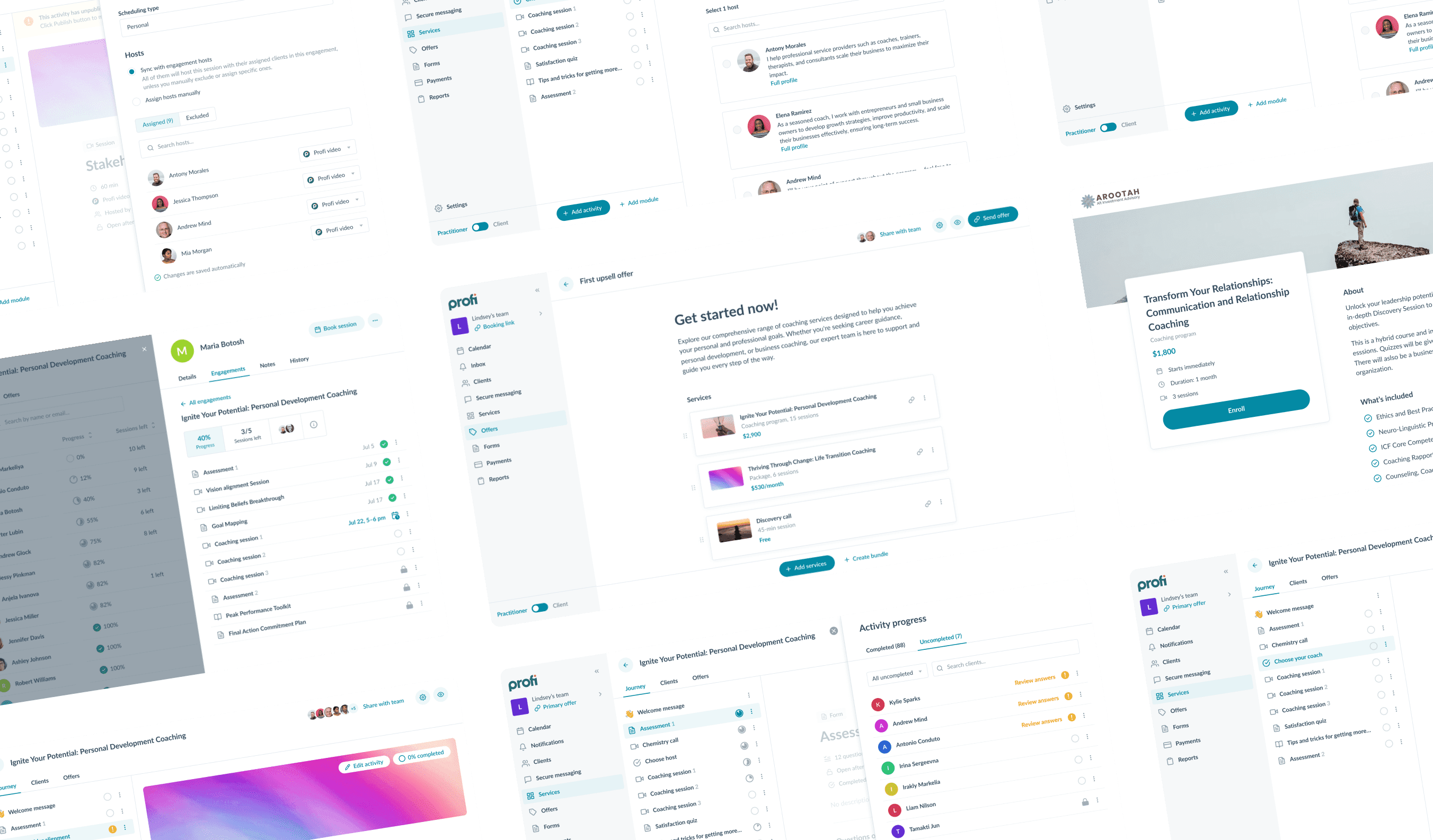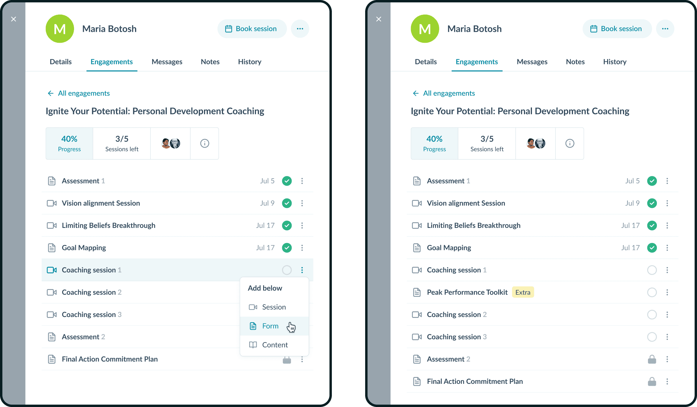Engagement позволяет создать любой формат услуги — от программы и пакета до их комбинаций, а также использует общий layout для всех ролей — меняются только данные и действия через матрицу прав.