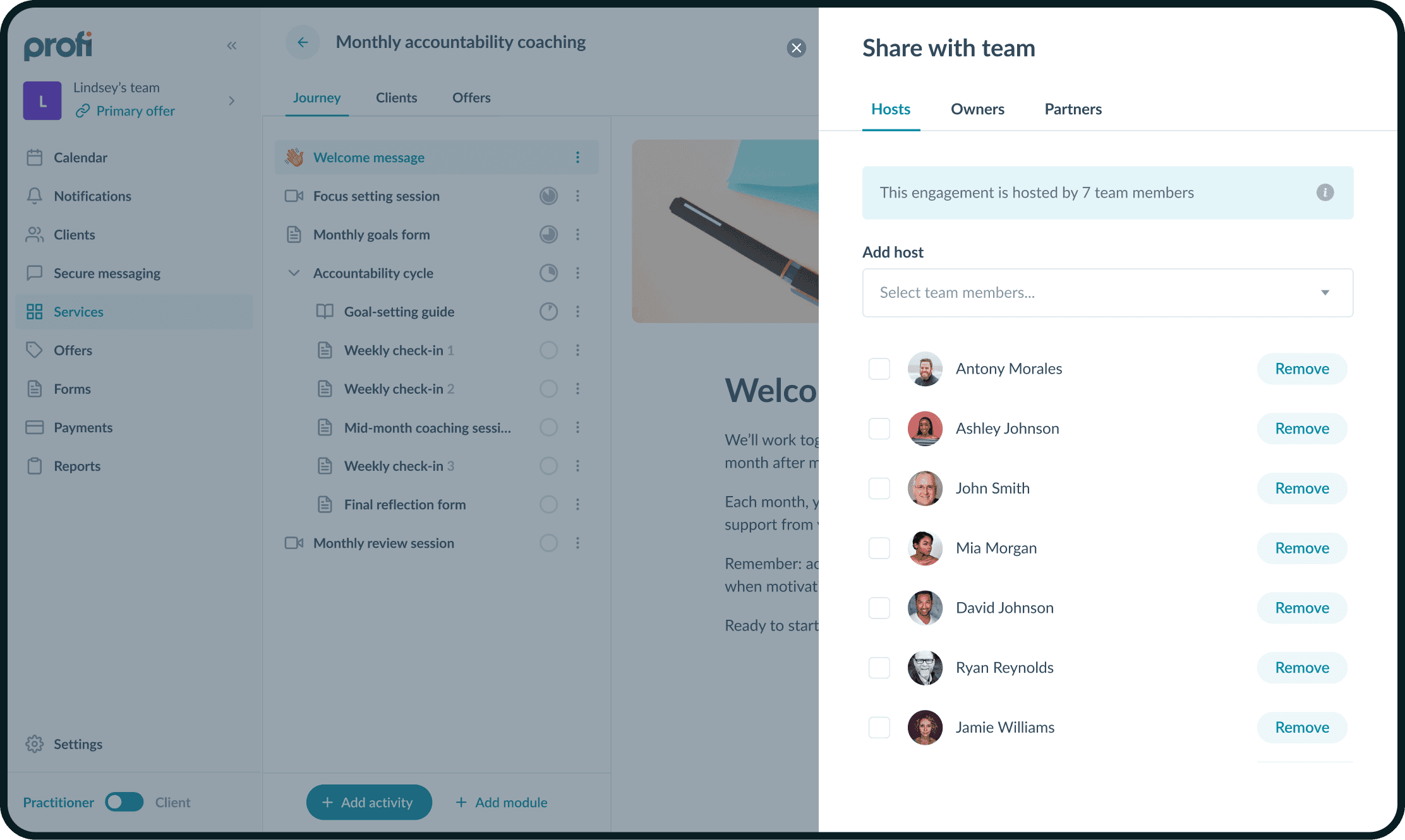 В енгейджменте можно назначать команду. Это создает пул коучей для автоматизации сразу нескольких ключевых сценариев: